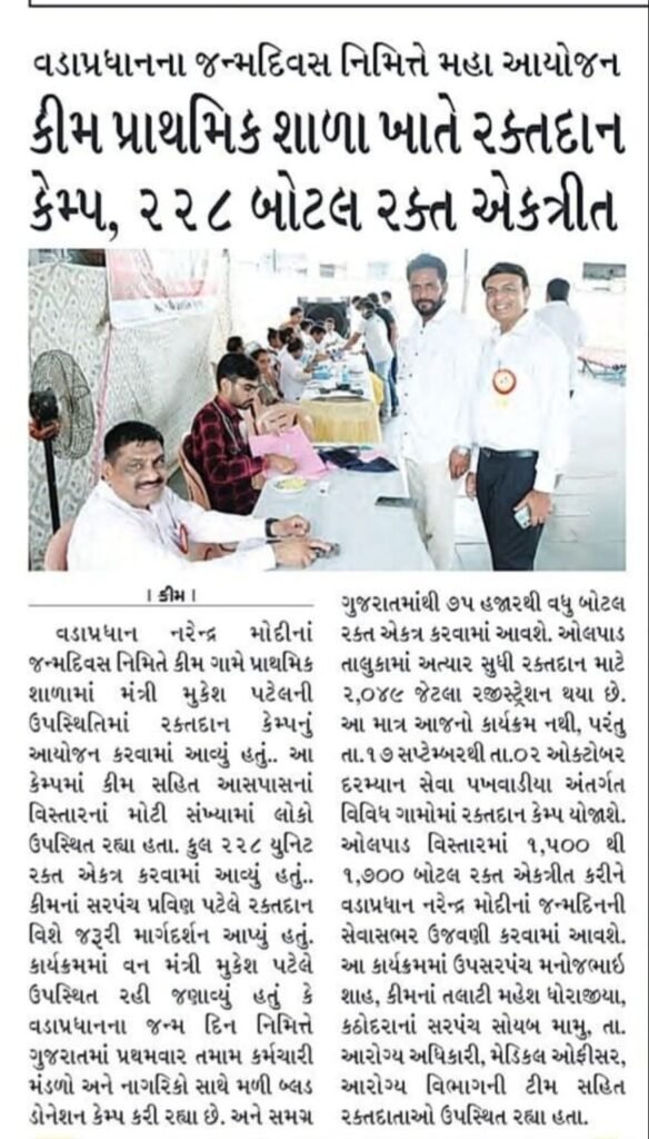 વડાપ્રધાનના જન્મદિવસે કીમમાં સેવા મહોત્સવ: પ્રાથમિક શાળામાં વિશાળ રક્તદાન કેમ્પ, 228 બોટલ રક્ત એકત્રિત